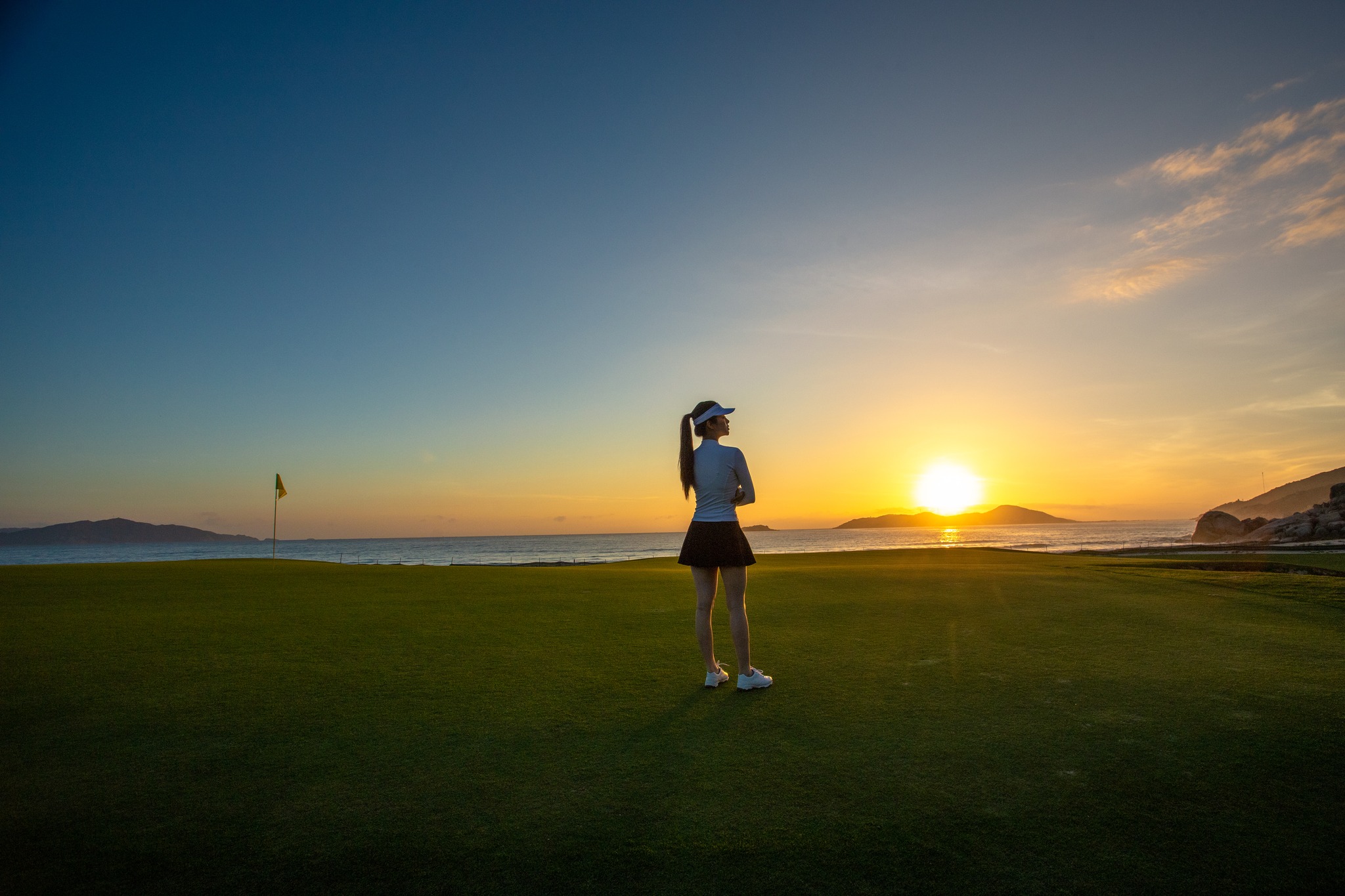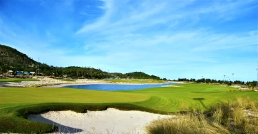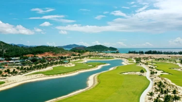 Địa hình: **Sân golf bờ biển (Links)**, kết hợp giữa cát trắng, rặng dừa và núi đá tự nhiên, tầm nhìn hướng ra Biển Đông.