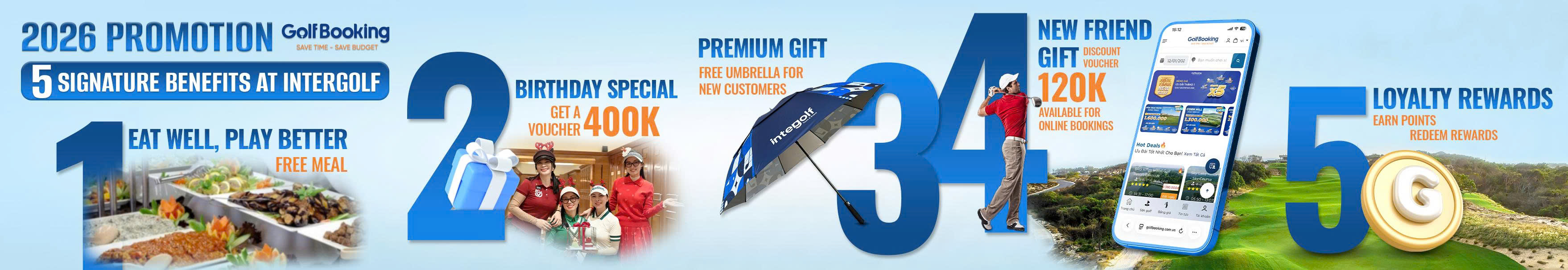• Lucky Money: Instant 120,000 VNĐ discount when booking via the new website interface: golfbooking.com.vn.